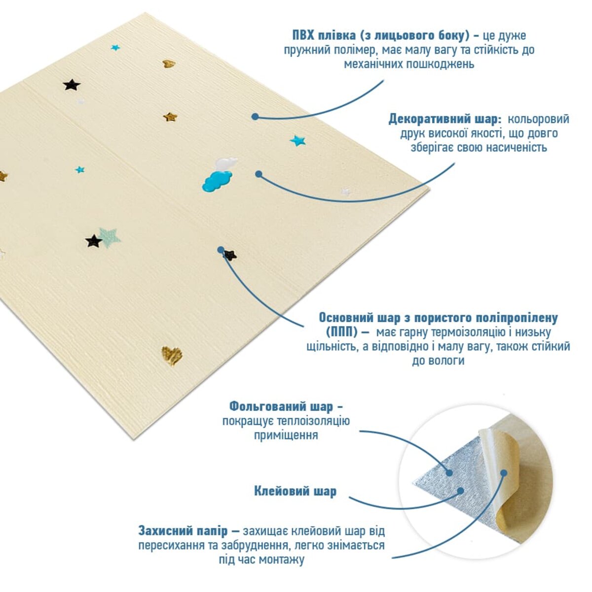 - Основний шар: пористий поліпропілен – термопластичний полімер з відмінними термо- та звукоізоляційними властивостями, стійкий до вологи та хімічно інертний.